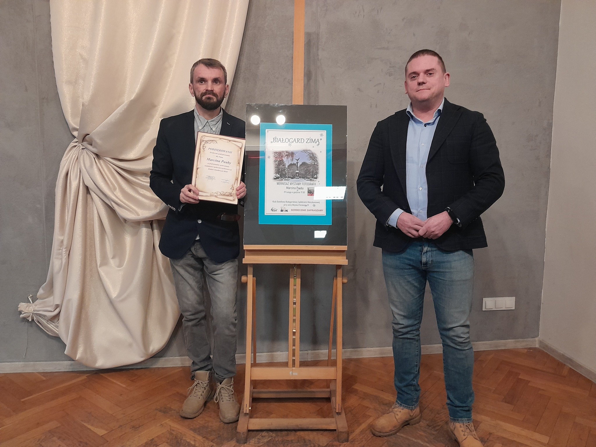 W Klubie Osiedlowym Białogardzkiej Spółdzielni Mieszkaniowej przy ulicy Wojska Polskiego 13, odbył się wernisaż wystawy fotografii Marcina Pauby pod tytułem "Białogard Zimą". Prezes Białogardzkiej Spółdzielni Mieszkaniowej Krzysztof Bednarz, podziękował Panu Marcinowi za zaangażowanie w działalność Klubów Osiedlowych BSM